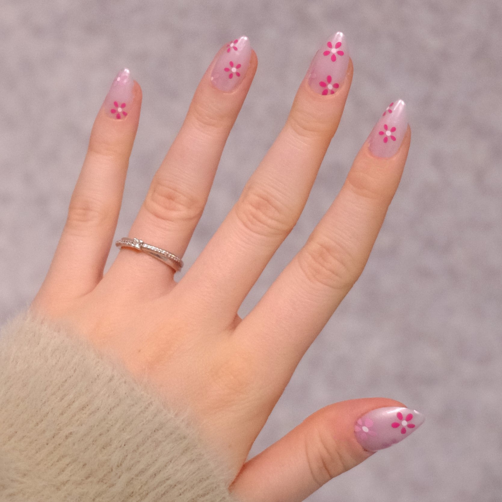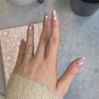 Pink Bloom er inspirert av nyutsprungne vårblomster. De delikate rosa blomstene mot en myk, glansfull base gir et friskt og feminint uttrykk som føles både naturlig og elegant. Perfekt for deg som vil ha en subtil, men sjarmerende detalj i looken din.